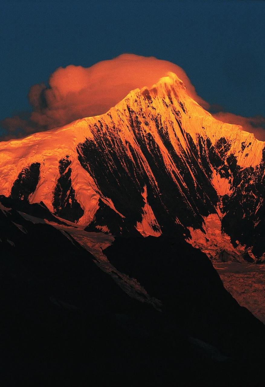 有一支歌颂卡瓦格博的锅庄,歌词大意是:神圣的卡瓦格博,你就在雪山之巅,我不用刻意双手合十为你祈祷,因为山上自然生长的香柏林就是天然双手合十为你祈祷的树木;我不用刻意用圣水为你敬献,因为山脚下流淌的澜沧江水就是自然为你敬献的圣水;我也不用刻意用水果供养你,因为我在农田里种植了果树,它们结的果,就是自然为你敬奉的果实。这是藏族人对一座山的描述,我们和自然是一体的。