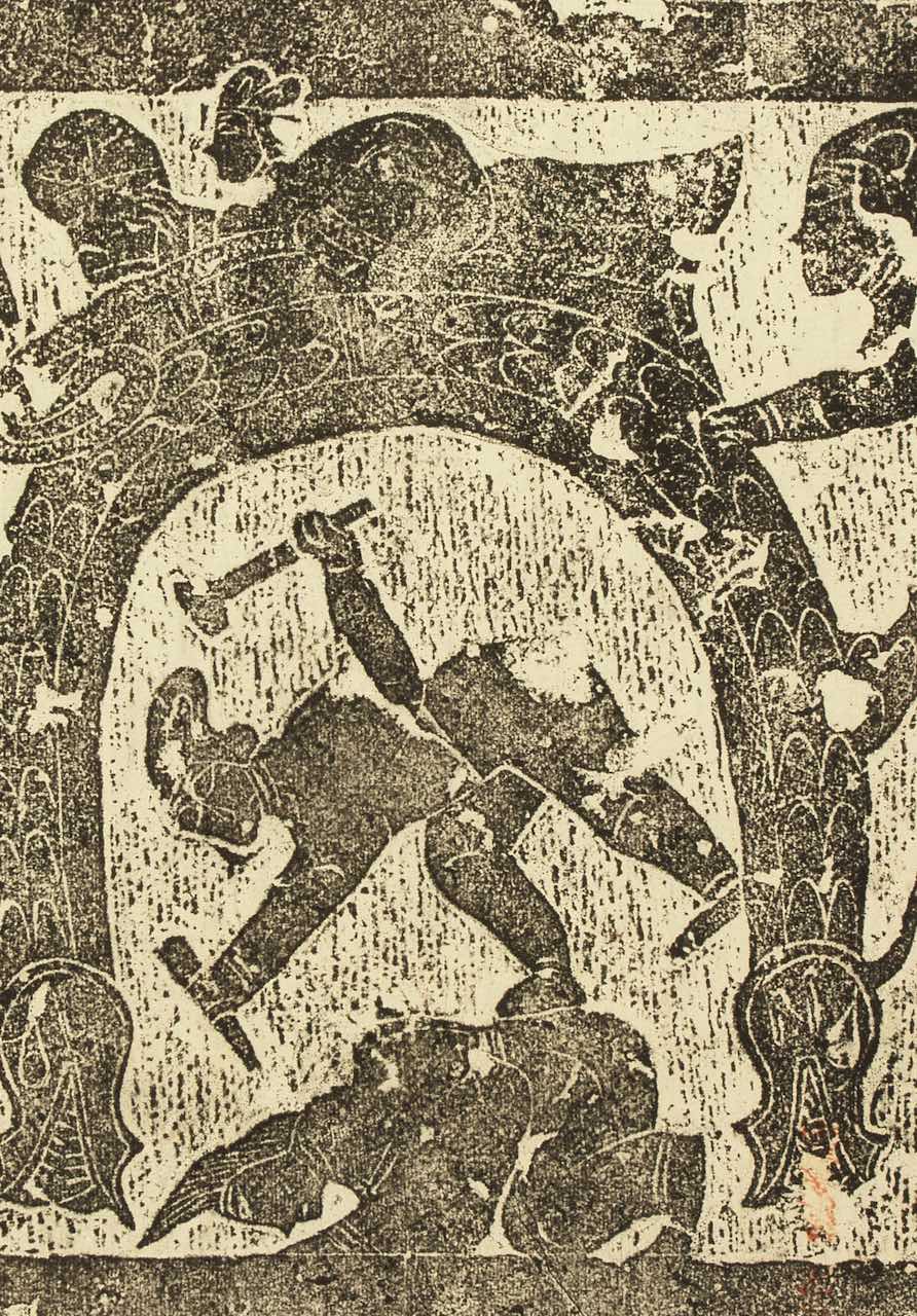 - 图3.15a 东汉,约公元1世纪。纸墨拓片。山东博物馆。图片选自 Chavannes, La sculpture sur pierre en Chine : au temps des deux dynasties Han,图43。画像石出土于山东省嘉祥县刘村。
