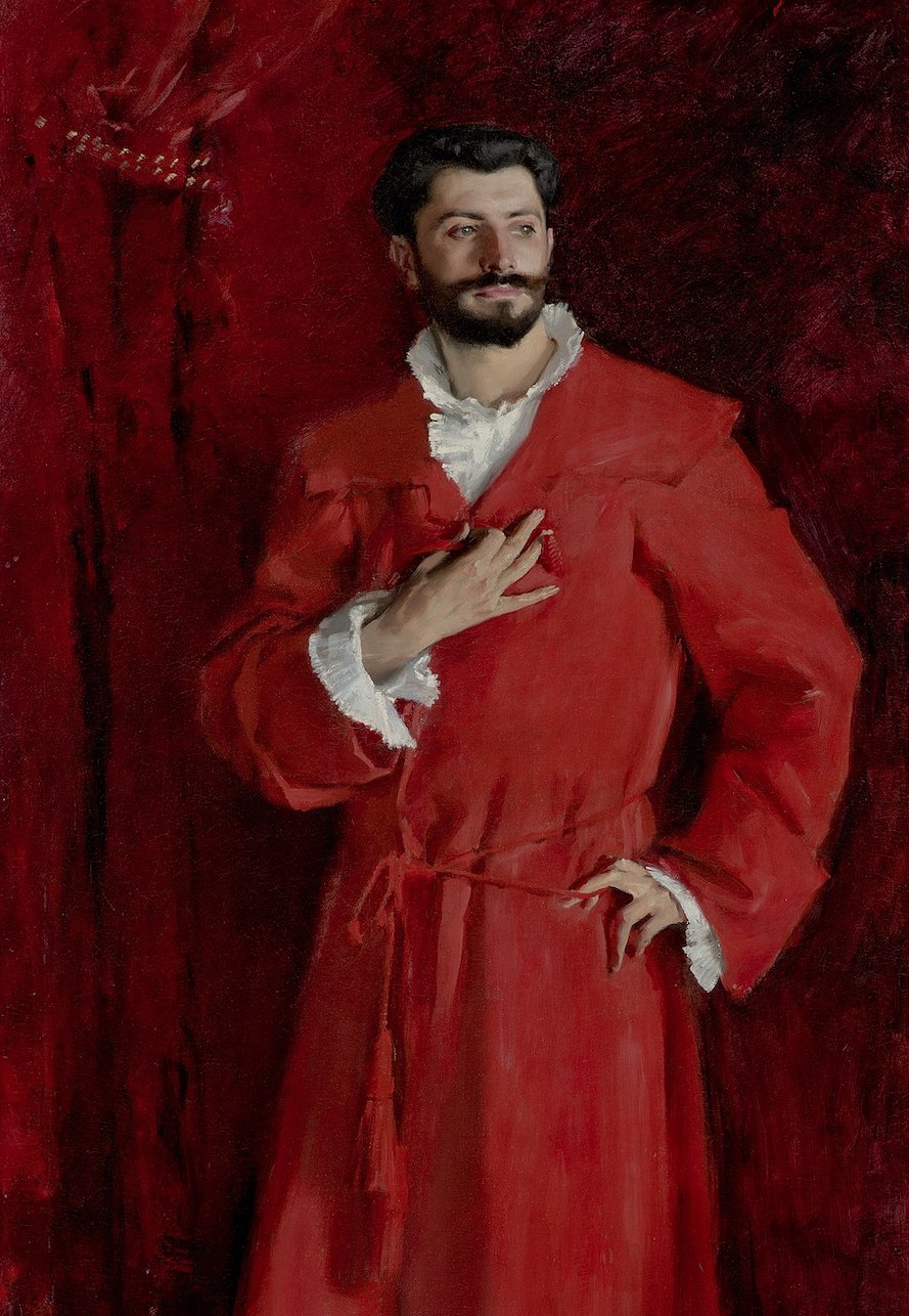 右手放在胸前,左手放在胯部。或许比这更具启发性:右手放在心口,左手放在腰间。这是画家精心设计的吗?三年后,他画了一幅名媛的肖像,在沙龙上弄得声名狼藉。(美好年代的巴黎会震惊吗?当然。它或许和伦敦一样虚伪。)右手在把玩一个貌似扣绳的东西。左手钩住长袍双股腰带中的一股,与背景中的窗帘环相呼应。视线顺着它们直抵一个复杂的结,结上悬挂着一对羽毛般毛茸茸的流苏,流苏上下交叠,正好挂在腹股沟以下,就像猩红色牛鞭。这是画家精心设计的吗?谁知道呢?他没有留下任何解释。但他是一位机灵又了不起的画家;一位了不起的画家并不害怕引发争议,甚至这正合了他的心意。