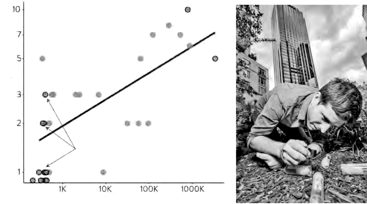 - 左图是物种多样性与岛状栖息地面积、曼哈顿街道隔离带中的蚂蚁和公园面积之间关系的一个例子。右图为克林特·佩尼克(Clint Penick,时任我实验室的博士后研究员,现在是肯尼索州立大学的助理教授)通过在小烧瓶中用糖引诱在隔离带地区的蚂蚁,然后从中取样。图源来自劳伦·尼科尔斯。基于萨维奇(Savage)、艾米·M.(Amy M)、布里特妮·哈克特(Britné Hackett)、贝努瓦·盖那德(Benoit Guénard)、艾尔莎·K. 扬斯特德(Elsa K.Youngsteadt) 和罗伯特·R. 道恩(Robert R. Dunn) 的数据分析,“曼哈顿城市生境镶嵌的精细异质性与蚂蚁组成和丰富度变化的相关性”,《昆虫保护和多样性》,2015 年第 3 期第 8 卷:第 216 页至第 228 页。本图由劳伦·尼科尔斯拍摄。