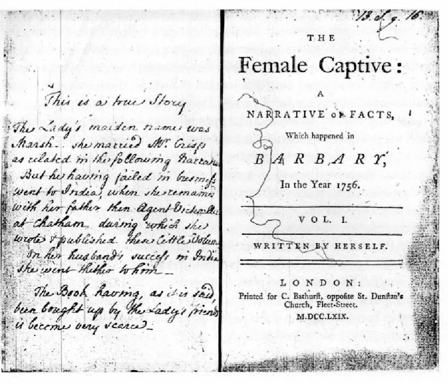 和米特伦不同,伊丽莎白·马什被劫持的时候只有 20 岁且未婚。她告诉读者,1756 年她乘坐安号时还没结婚(和她同时代的人会理解成她还是处女),身边没有男性亲属保护她。向读者坦白这些是一个了不起的行为,用她的话来说是一次“勇敢的尝试”。在英属北美,被美洲原住民俘虏的妇女获得自由后会用笔记录或者口述自己的经历然后出版,这已经成为一种传统。北美土著士兵很少强奸女俘虏,这点基本尽人皆知。但在摩洛哥和奥斯曼帝国,女俘虏往往没这么幸运,欧洲人对此深信不疑。