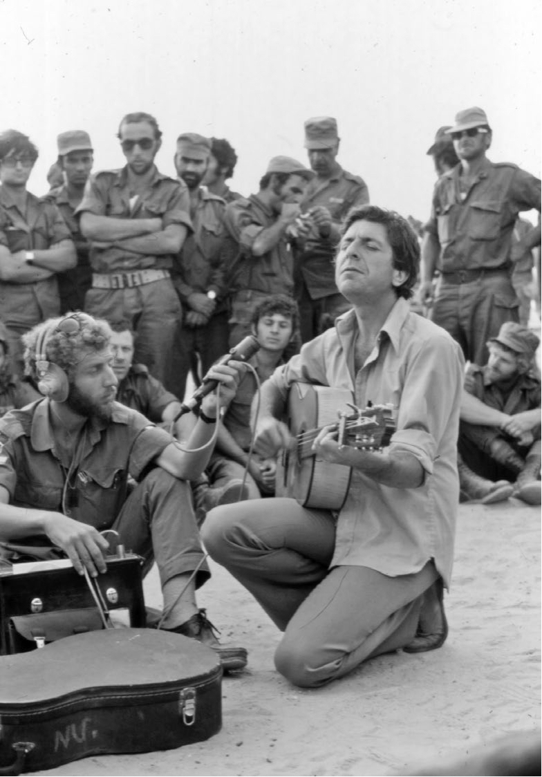 因为这里是沙龙的总部,也因为这位将军吸引了人们的注意,所以人群之中有些人带着相机。因此若你见过科恩在西奈的演唱会的照片,很可能就是这一次演唱会。当时还有一位陆军广播电台的技术人员,可以看到他在录制节目,但不清楚这些录像带的情况如何。这些照片能让人们想象出战争巡演中许多没有记录的演出画面:沙地上的吉他盒上用粉笔写着马蒂的名字,属于马蒂·卡斯皮;科恩的军装;蜷缩在歌手身边的士兵。