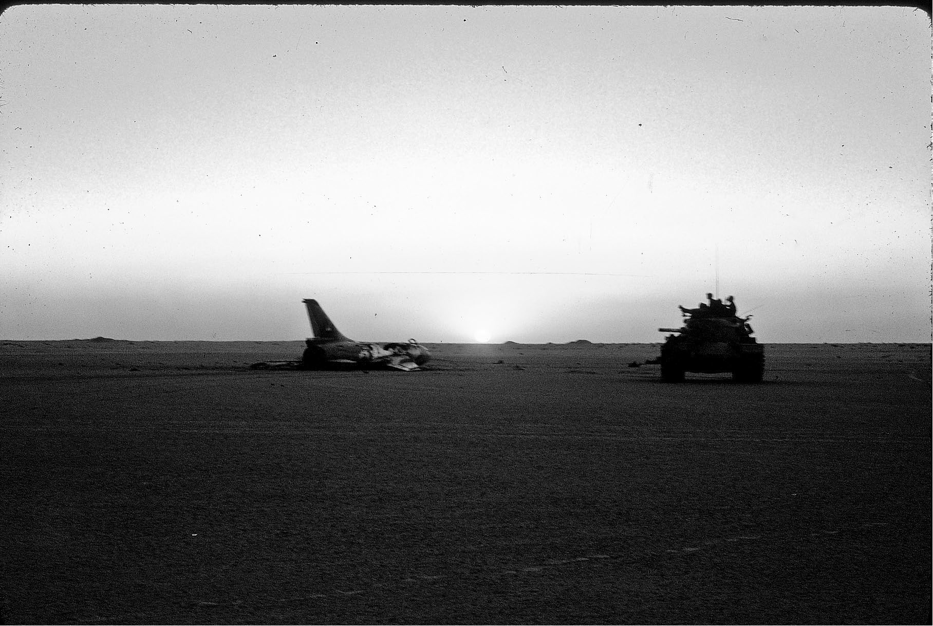 25.一架直升机将我们送到运河的非洲一侧。这个机场在一两天前就被占领了。我们在一个混凝土机库里唱歌。墙上挂着一本埃及日历,埃及人还留下了一些食物。我突发奇想,想在这些铁皮罐子旁边睡上一觉。其中一个巨大的土豆泥罐子上写着:来自加拿大人民的礼物。