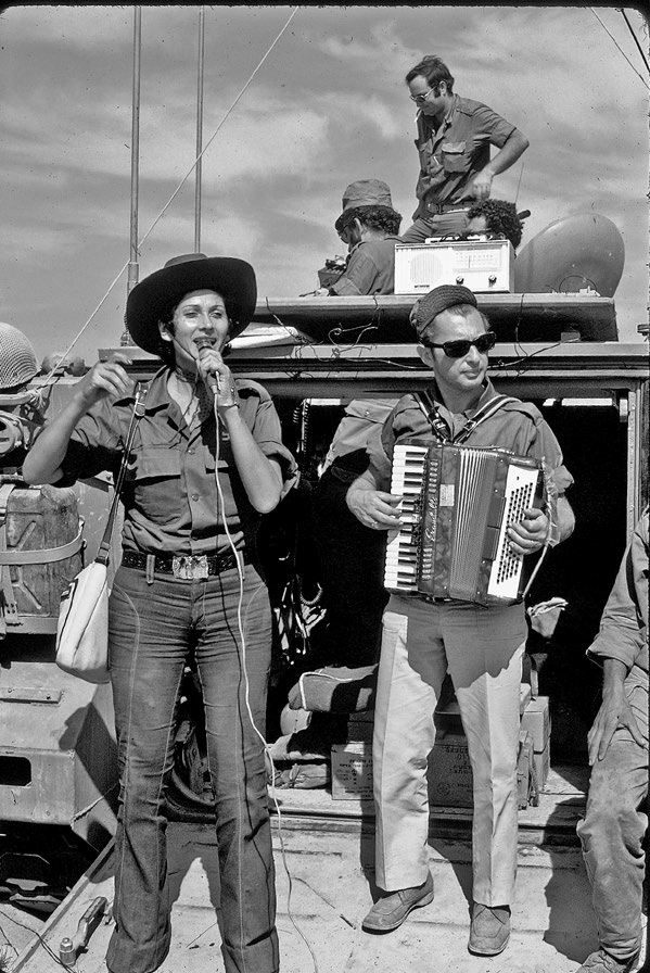 雅法·雅克尼(Yaffa Yarkoni)是独立战争时期著名的民谣歌手,时年 47 岁。她就在那里,与前线的部队一起渡过苏伊士运河,当时军队还没有实际控制该地区。不远处的沙地上散落着穿制服的尸体。她设法与一名手风琴手一起穿过运河,想要去提高士兵的士气,至死方休。她穿着牛仔裤和军装衬衫,脖子上系着一条橙色手帕。