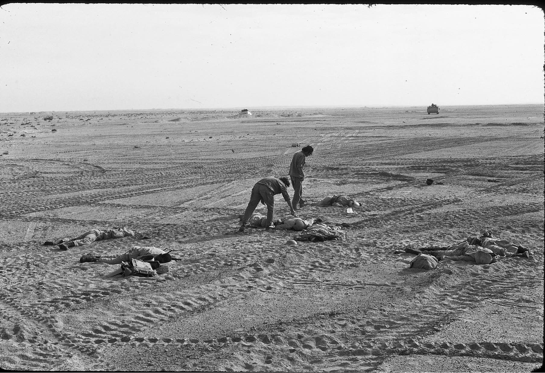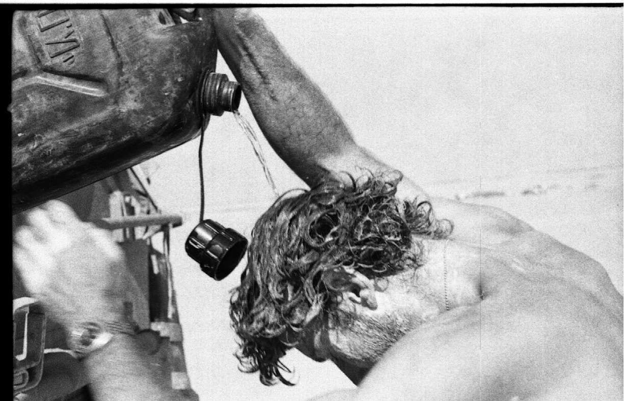 就像这段叙述没有确切日期一样,接下来发生的事情具体是在哪一日也不清楚。什洛米认为是在当天晚上,他刚从沙漠中扫荡回来,回到他们的临时营地为吉普车找燃料罐。他需要汽油,但只有柴油。营地里是一群安静的脏兮兮的人,还有油箱空空的吉普车、带着火箭弹孔和血迹的装甲车、几辆坦克。一些士兵在降落伞做成的帐篷附近吃着作战口粮。