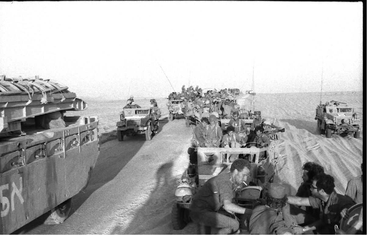 现在,以色列人终于从开战第一周的震惊中恢复过来。他们的计划是赌一把,渡过运河,突破到埃及一侧,也就是以色列士兵称之为“非洲”的地方。这样一来,要么可以结束战争,要么以灾难告终。整个军队都在向运河移动,穿过沙漠的道路上塞满了卡车、被征用的民用汽车和公交。以撒也拍到了这个镜头。