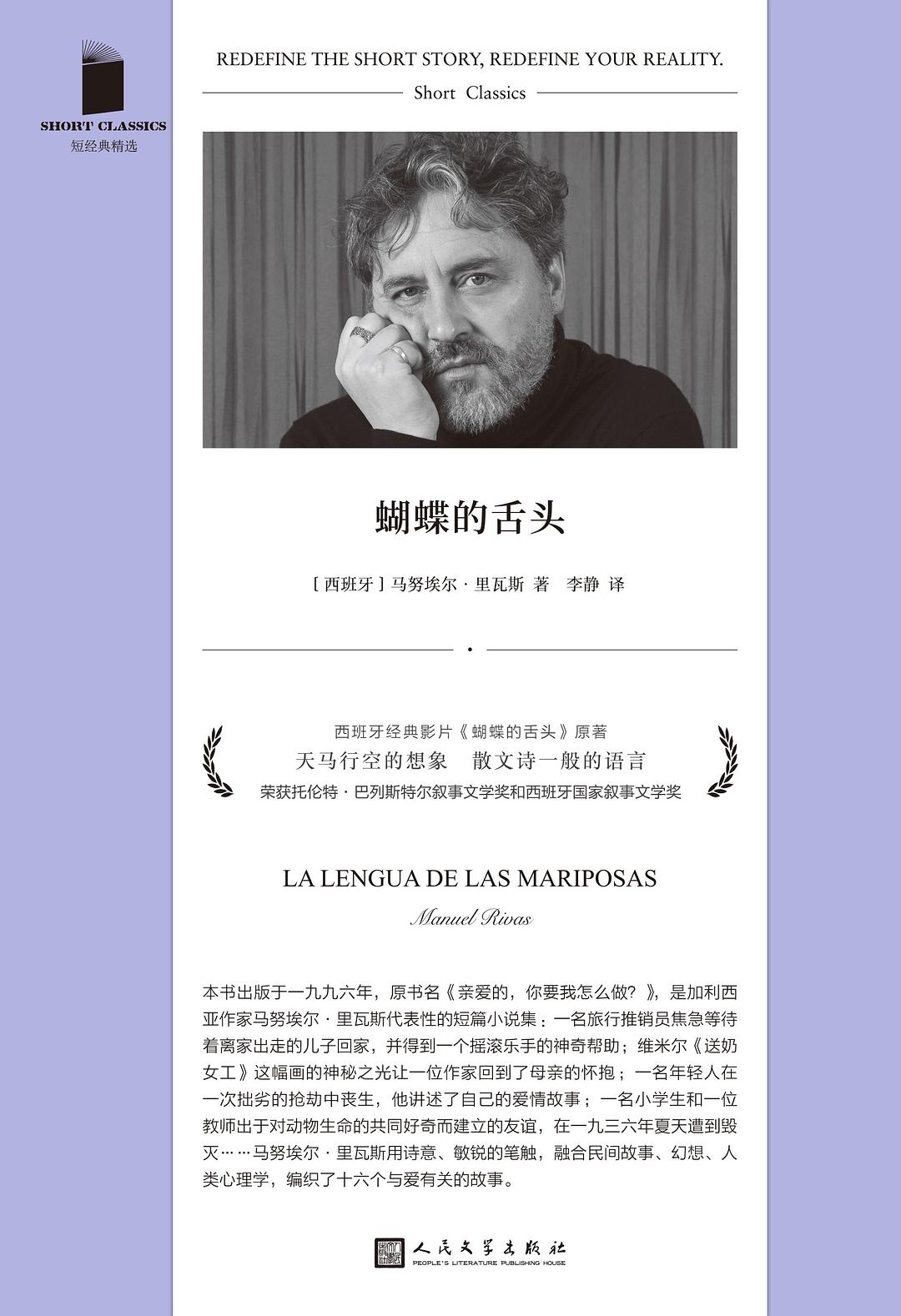 《蝴蝶的舌头》出版于一九九六年,原书名《亲爱的,你要我怎么做?》,是加利西亚作家马努埃尔·里瓦斯代表性的短篇小说集,他用诗意、敏锐的笔触,融合民间故事、幻想、人类心理学,编织了十六个与爱有关的故事: