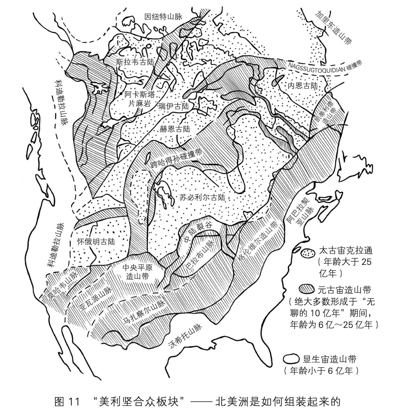 其次,在“无聊的 10 亿年”期间,随着全新的板块构造系统将太古宙的地壳碎片汇聚到了一起,然后以火山弧的形式建造了附加物,坚固耐用的现代陆核被组装了起来。在威斯康星州,我脚下的基岩(被横跨美国中西部和大平原的较年轻的沉积物所掩埋)几乎完全来自元古宙;它们是在“无聊的 10 亿年”时期由造山运动形成的,当时大片的陆壳被并入了古老的加拿大地盾。那个时期或许很无聊,但其在发展地球基础结构上卓有成效——这是现代地球居民可以效仿并从中受益的另一个模板。
