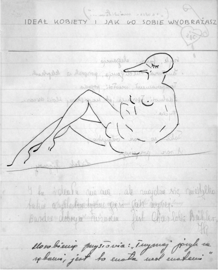 我只认出了参与这个“我问你答本”游戏中的两个人:一个是署名为“扬·头发掉汤里斯基”的娜沃亚,还有一个是署名“齐格”的齐格蒙特·希姆恰克。还有一位虽然留了真名——神父泰奥菲尔·T.J.——但是却没有留下姓氏,他是一位耶稣会会士。伊赫娜大概邀请了这位学校的传教士来参与到游戏中,他的答案就夹杂在伊赫娜同龄人那些悸动风骚和颠三倒四的回答之中。除此之外,化名为小兔子、小皮特、猫咪、包子、维基、—我—、恶之子、SP(也可能是 SD)、WE 和“军中之友”的人也都加入到了这个游戏之中。