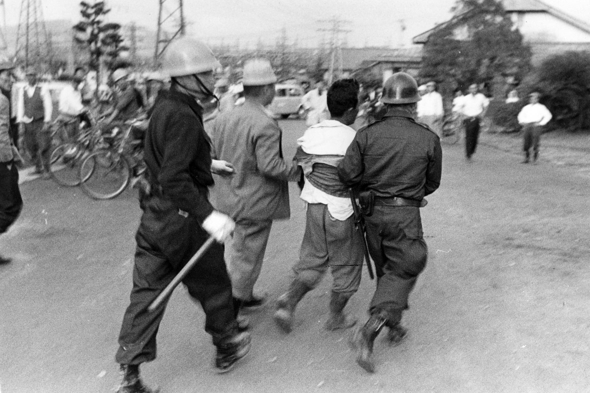 - 1959 年 11 月 2 日,警察带走闯入窒素水俣工厂的一位渔民。图片来自 The Asahi Shimbun via Getty Images