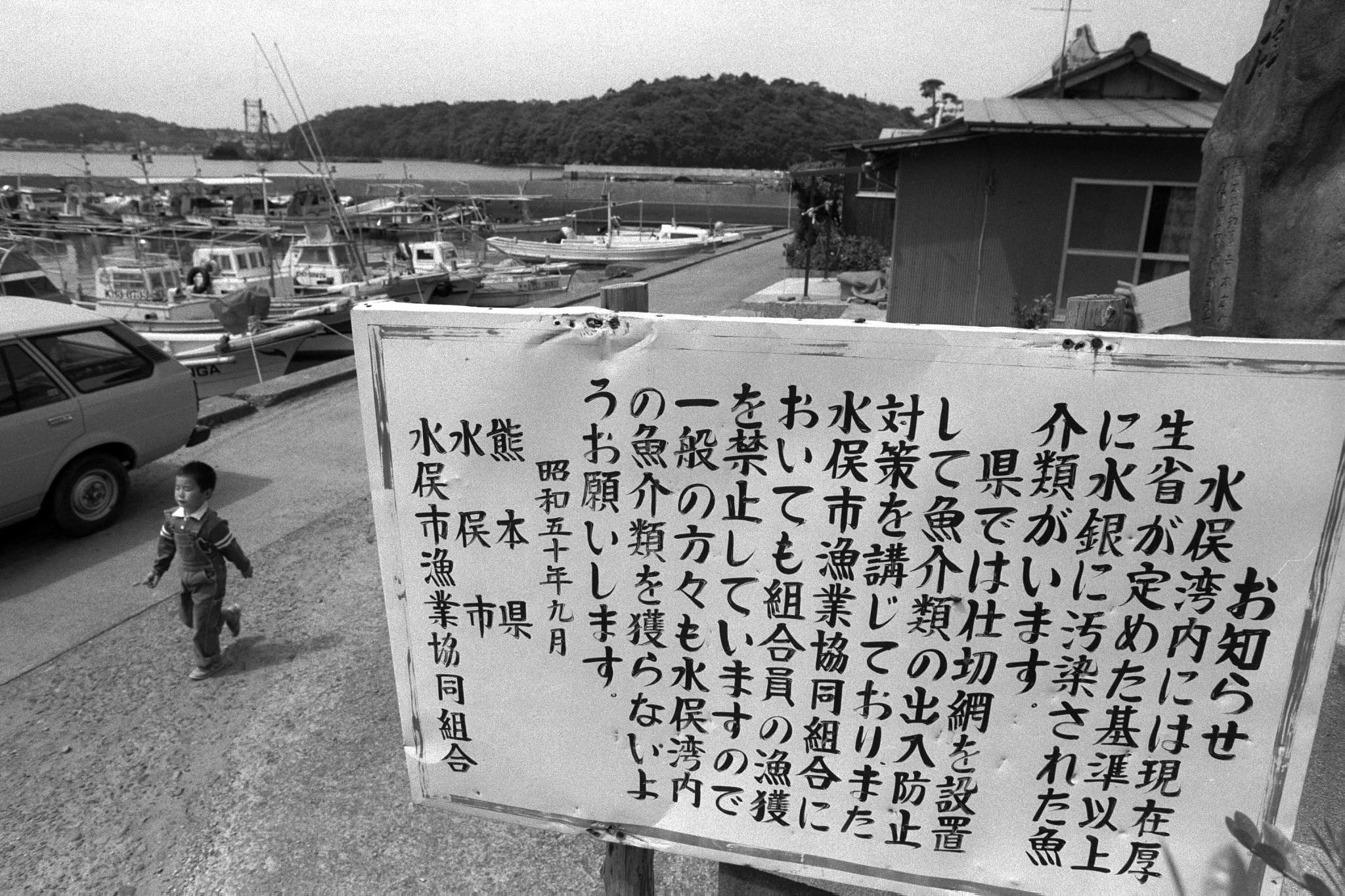 - 1986 年 4 月,熊本县水俣市,禁止捕鱼的告示。图片来自 The Asahi Shimbun via Getty Images