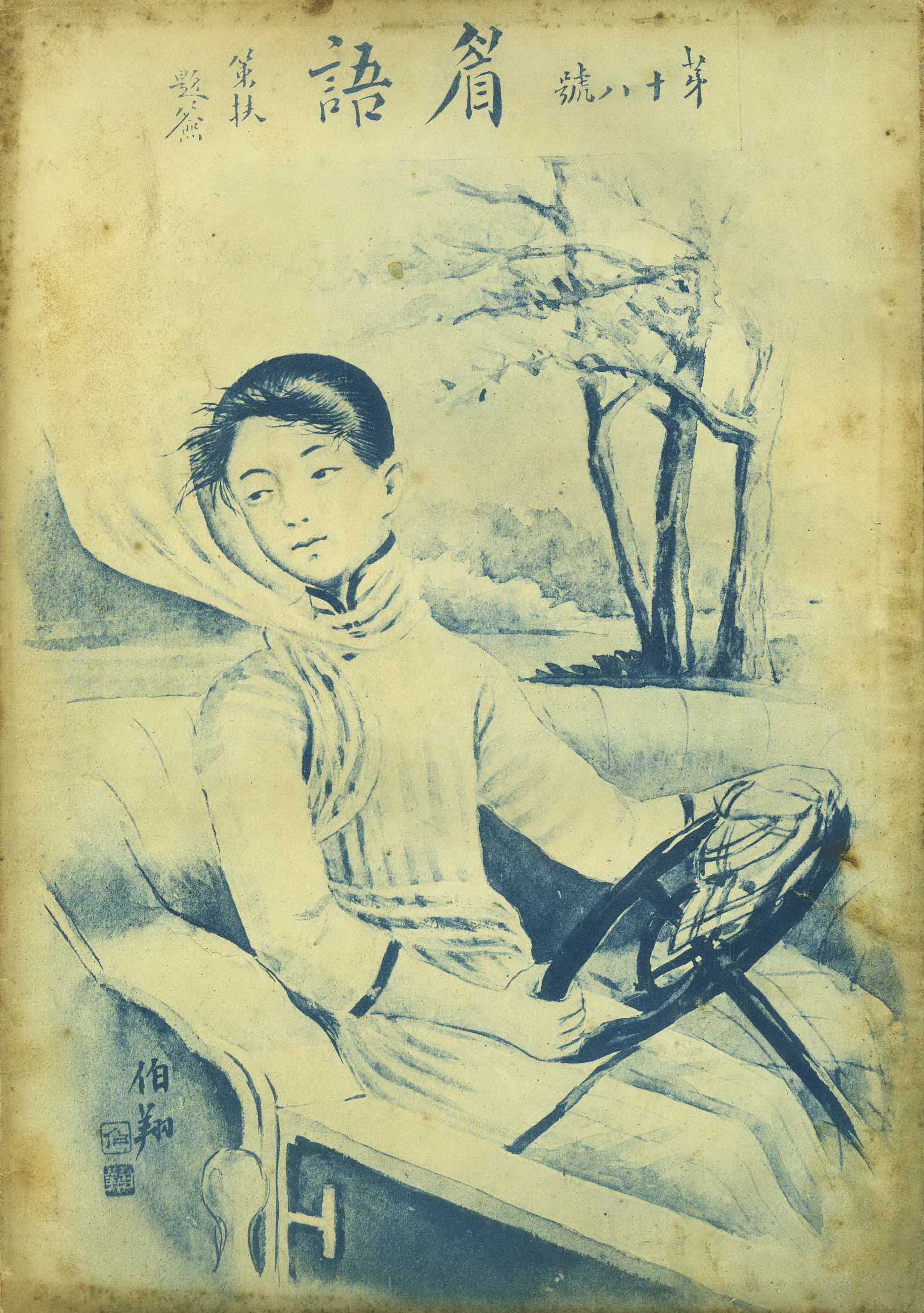 而更有趣的比较,则出现在《眉语》第六期裸体封面与《眉语》最后一期的女子驾车封面。此两封面的女子发式,都是当时最时髦流行的“卷帘式前刘海”,然前者通过飘飞薄纱所带出的气韵生动,已全然转换成后者经由机械车辆所造成的移动速度。虽然驾车女子的脖子上亦围有飘飞的薄纱围巾一条,然此薄纱围巾已非《眉语》第一期与第六期裸体封面上用来营造美学氛围的薄纱围巾(既呼应神话飞天仙女的衣袂飘飘,亦呼应彼时西方女性裸体摄影的欲遮还羞),而是民初女学生在粉颈上系围巾的时髦打扮,一如当时的讽刺诗所言:“两肩一幅白绫拖,体态何人像最多。摇曳风前来缓缓,太真返自马嵬坡。”(谷夫)而飘飞的薄纱围巾,其动势乃同时指向车子的行径风速与大自然的风向(由中景大树的枝丫走势带出),让自然与机械、气韵与速度相互折叠。这幅由民初另一位知名的月份牌画家胡伯翔所绘制的“时装美人”,虽采“平光”的“无影绘法”, 却已成功运用前、中、后三景与笔墨的浓淡深浅,拉出空间深度与焦点透视感。