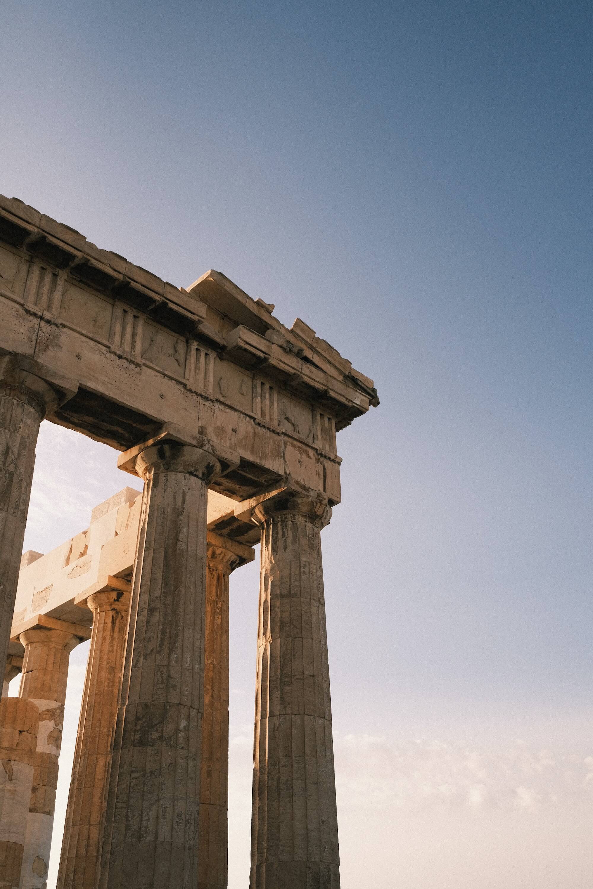 希腊神庙是简单的梁柱式结构, 其中有两种基本立柱:多利亚和爱奥尼亚柱式。其中多利亚式柱子形状孔武有力,代表了多立克人斯巴达人的尚武;爱奥尼亚柱式则精致、柔情、自由, 维特鲁威把这种柱子想象成一个女子。爱奥尼亚人是广泛意义上更古老的希腊人,多在东爱琴海和小亚细亚的殖民地,那里也是孕育希腊哲学的地方。
