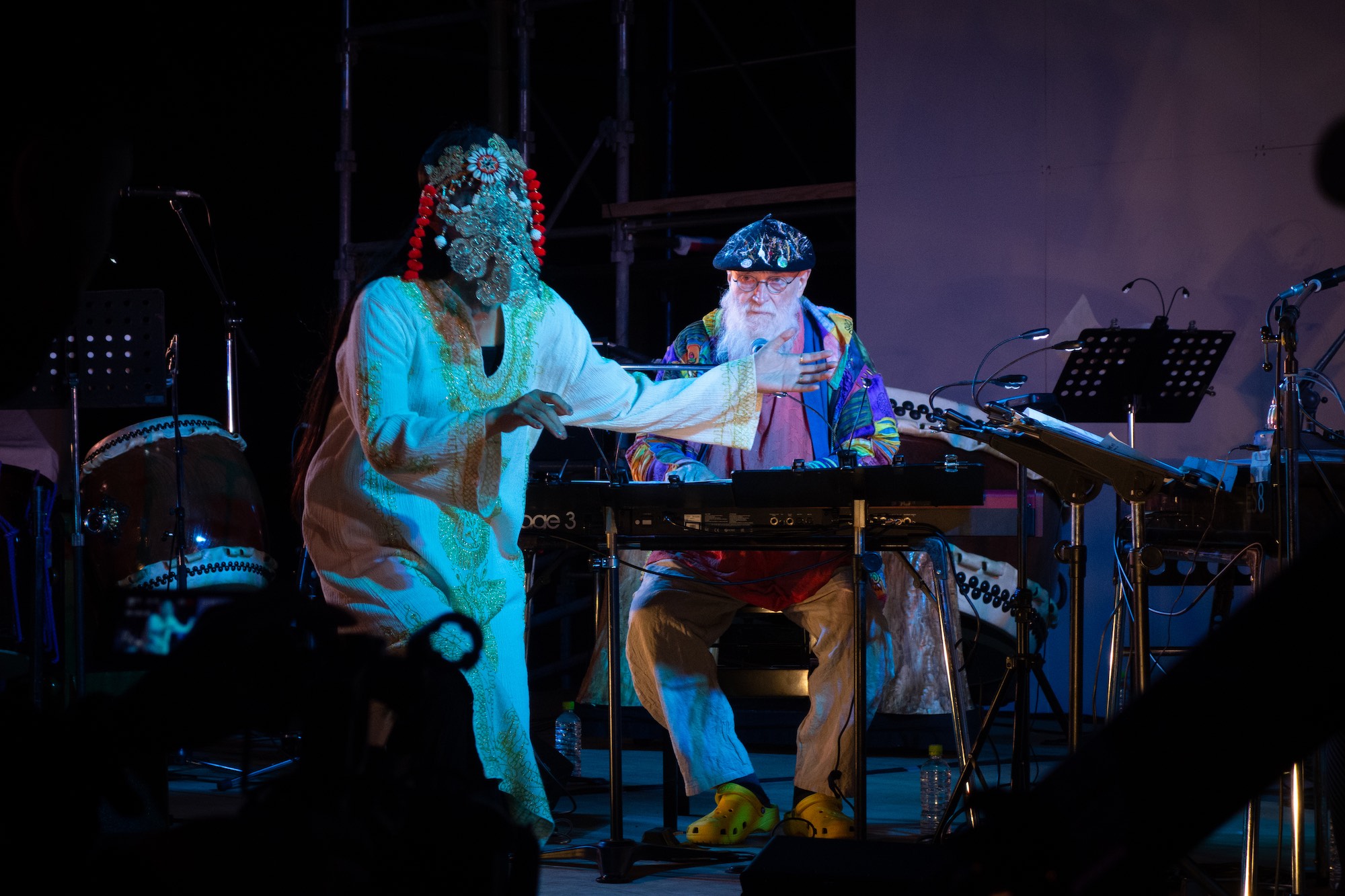 - Terry Riley 现场音乐会情景。他在去年的佐渡岛银河艺术节中参与凌晨五点开始的现场音乐会,有八十多位观众欣赏他富有实验性的表演。