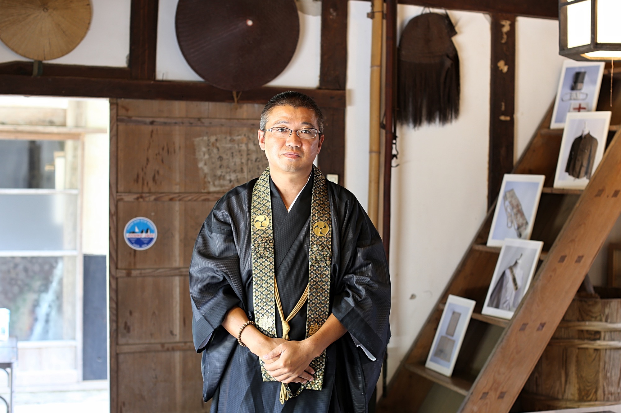 梶井照阴的最新作品系列《佐渡,每个人的战争》展出于该岛中部“大庆寺・长屋门”,也属于真言宗寺庙,院子里我看见有一位中年男子正在劈柴,跟他搭话便得知对方是该寺庙副主持。他非常热情地给我介绍这里的画廊来历,是他的母亲四十多年前利用院内的传统建筑“长屋门”开办的,作为这一带唯一能够接触艺术品的展示空间,曾颇受附近居民的欢迎。顺藤摸瓜,他又谈及该寺庙和当地檀家(施主)的关系,传统民间工艺的衰落和传承之困难,也谈到了佐渡岛银河艺术节。他从仓库里拿出好几个竹篮给我解释,竹编器具是佐渡岛的传统工艺品之一,该寺庙所在的金井地区生产适合竹编的竹子,曾经在农闲期间村民们聚在一起制作竹背篓、竹筐或竹篮等生活必需品,本来是普通不过的情景。