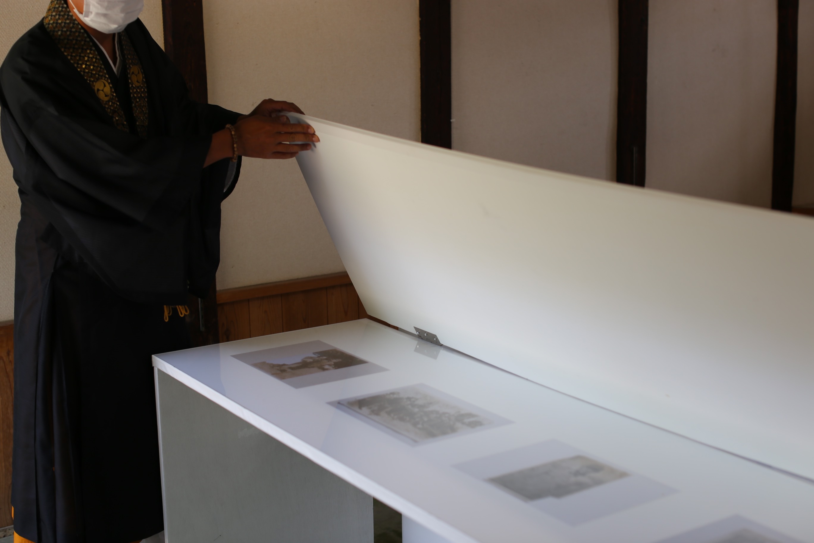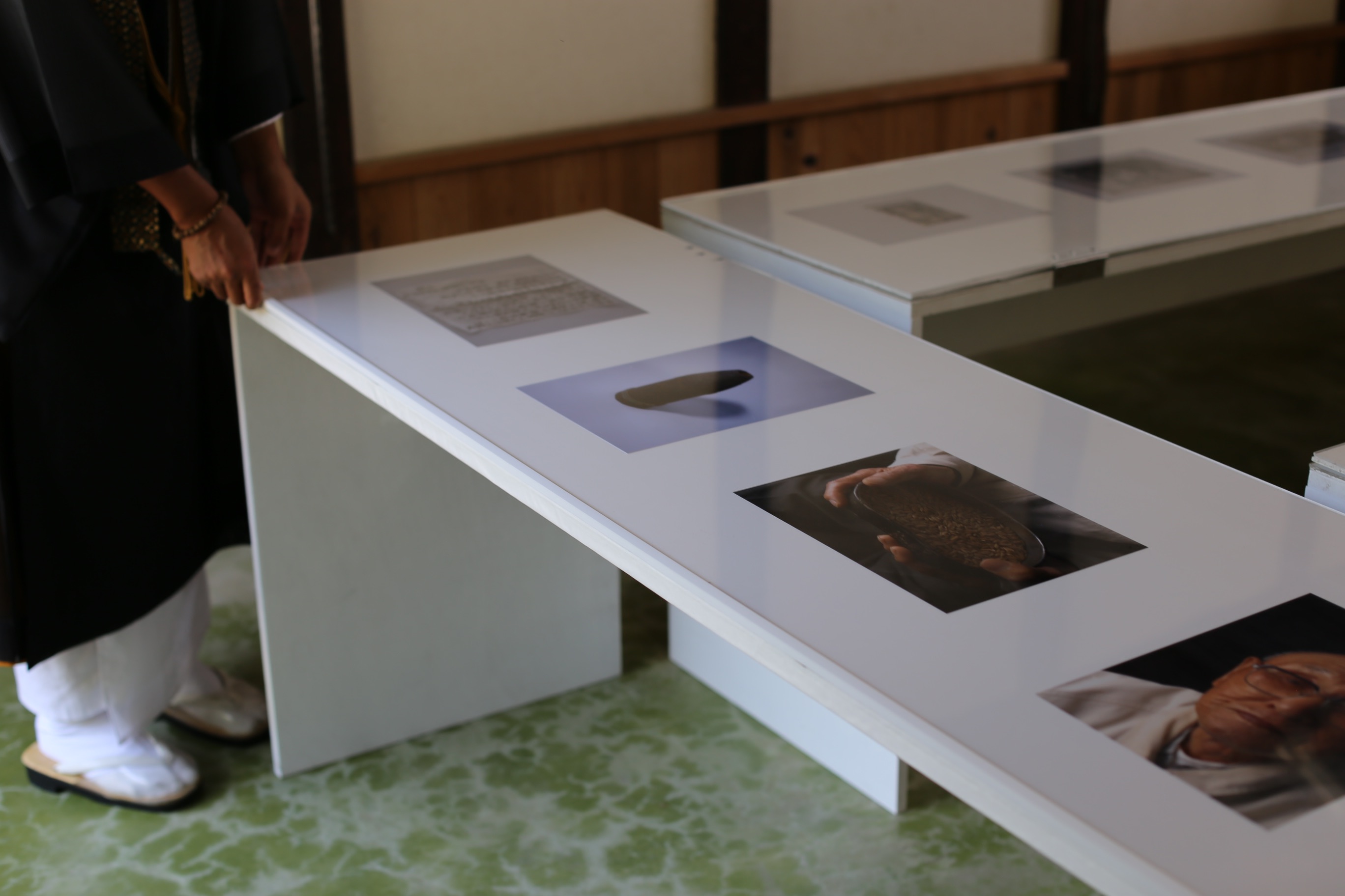 之后没多久梶井照阴就出现了,他上午刚结束了葬礼法事,连僧袍都还没换就直接开车过来。他非常平静地跟我们寒暄几句,随后到我在展览空间转一圈,每张作品一个接一个地给我解释。